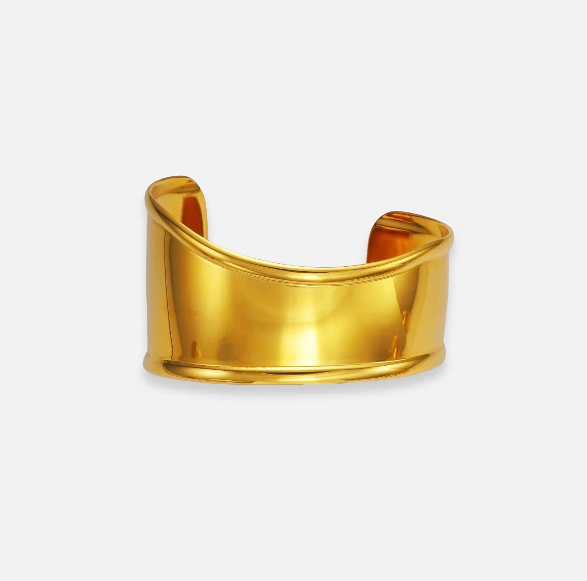 Sculptée comme une œuvre d’art, cette manchette dorée capte la lumière et sublime le poignet.