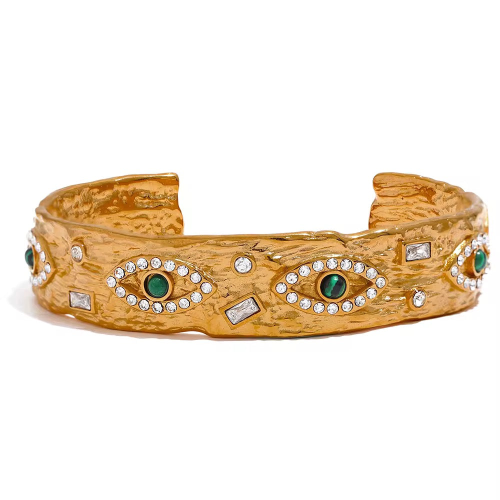 Le Bracelet Émeraude Or est une pièce unique, alliant la richesse du doré martelé à la profondeur des pierres vertes. Orné de motifs en forme d’œil sertis de cristaux scintillants, il incarne à la fois protection et raffinement. Sa finition texturée lui donne un charme artisanal luxueux.