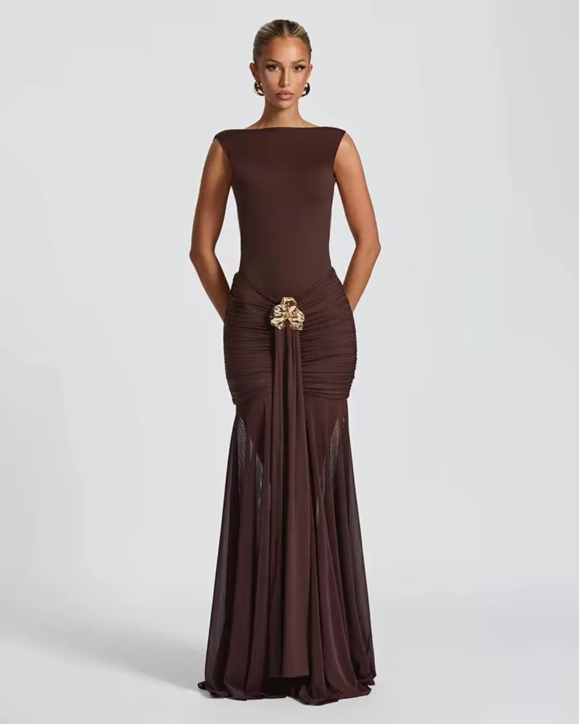 La Robe Aphrodite incarne la féminité absolue. Dans un marron profond et envoûtant, elle sculpte la silhouette avec élégance et fluidité. Son détail doré à la taille souligne la ceinture naturelle avec une touche luxueuse, rappelant la déesse de l’amour et de la beauté.